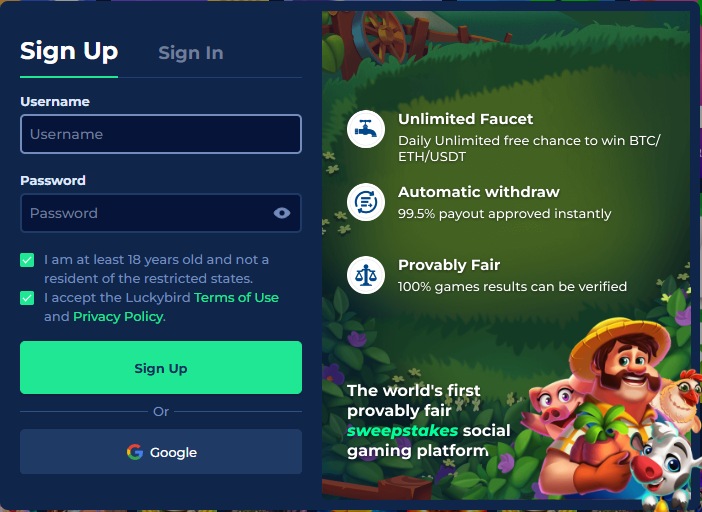 There isn’t a LuckyBird.io promo code you need to enter. Bonuses activate automatically, including signup rewards, faucet refills, and SC task payouts. Just log in and the system starts crediting.